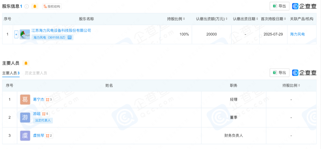 近日,海力海上風(fēng)電裝備(溫州)有限公司成立,法定代表人為游超,注冊資本為20000萬元。新公司經(jīng)營范圍包含:新能源原動設(shè)備制造;海上風(fēng)電相關(guān)裝備銷售;海洋工程裝備制造;海洋工程裝備銷售;海洋工程平臺裝備制造;海洋能系統(tǒng)與設(shè)備銷售;海洋能系統(tǒng)與設(shè)備制造;海洋工程關(guān)鍵配套系統(tǒng)開發(fā);海上風(fēng)電相關(guān)系統(tǒng)研發(fā);風(fēng)電場相關(guān)系統(tǒng)研發(fā);風(fēng)電場相關(guān)裝備銷售等。企查查股權(quán)穿透顯示,該公司由江蘇海力風(fēng)電設(shè)備科技股份有限公司100%持股。