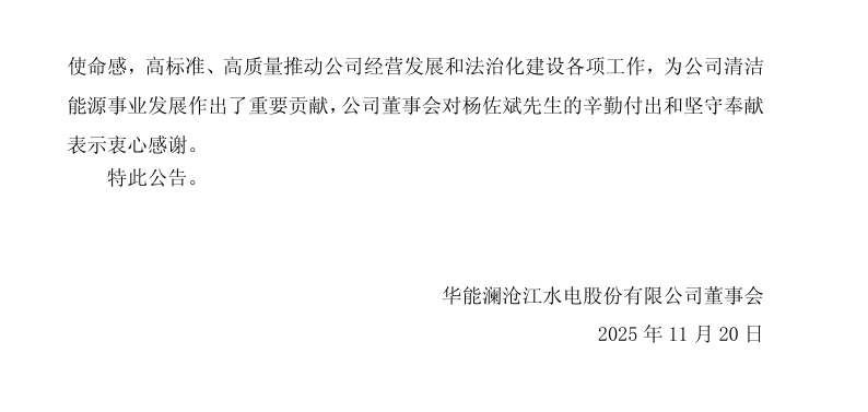 楊佐斌辭去華能瀾滄江水電股份有限公司副總經(jīng)理等職務(wù)。